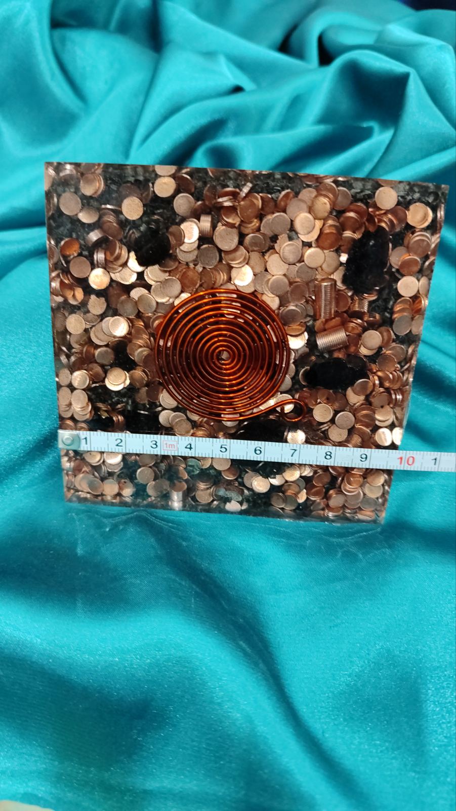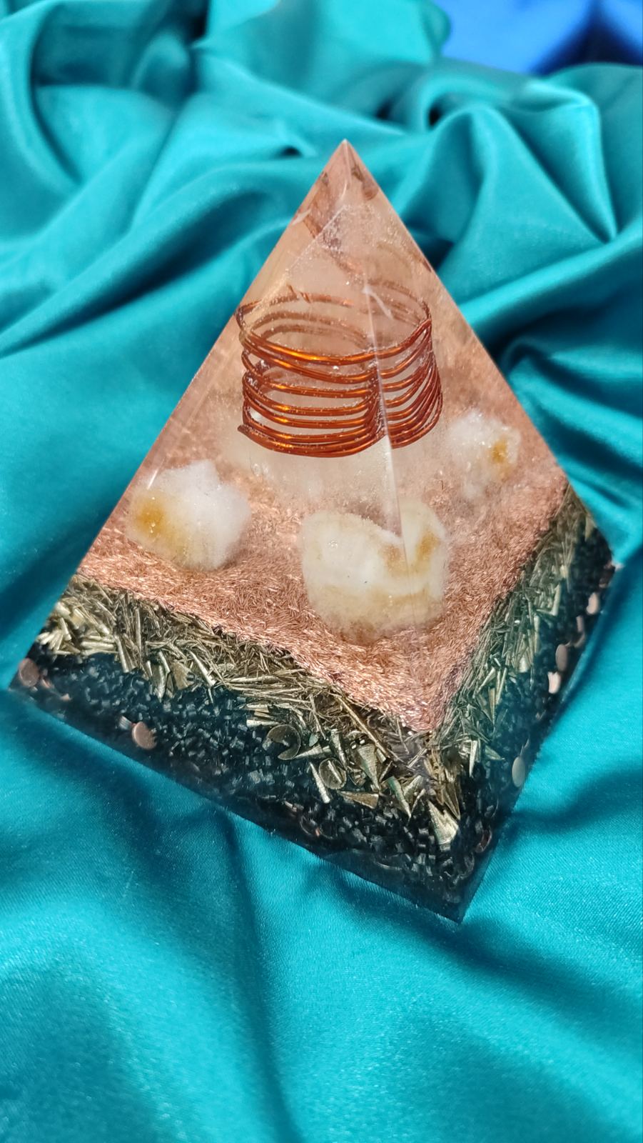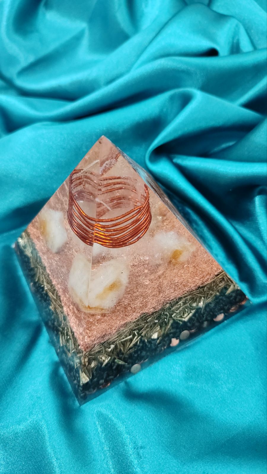 Ova orgonit piramida dimenzija 9,5 x 9,5 cm nosi snažnu energiju svetlosti, obilja, jasnoće i lične snage. U njenom vrhu nalazi se čist, neprerađeni kvarc obuhvaćen bakarnom zavojnicom, što stvara snažan centar usmerene i pojačane energije. Nepolirani kvarc zadržava svoju prirodnu snagu i autentičnu vibraciju, dok bakar dodatno provodi, pojačava i harmonizuje energetski tok.