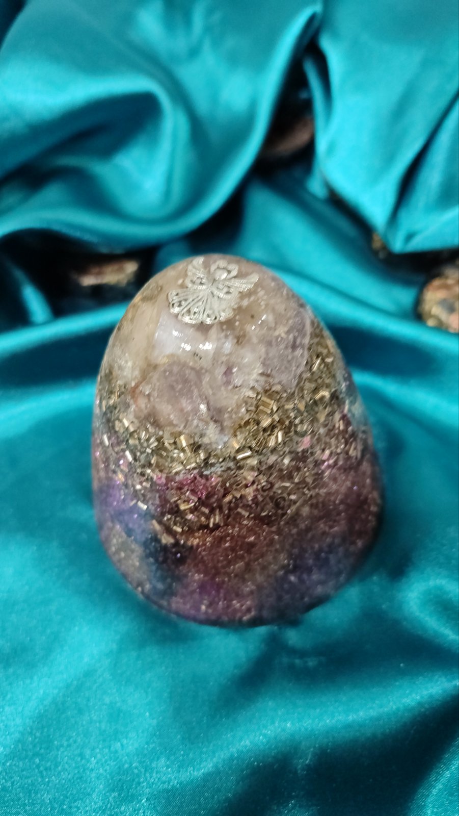 Ova orgonit kupa nosi u sebi suptilnu, ali snažnu energiju zaštite, mira i unutrašnjeg vođstva. U njenom vrhu nalazi se simbol anđela sa Ametist, zaliven u bakru i bronzi, uz dodatak ljubičastog glitera koji dodatno naglašava njenu duhovnu vibraciju i povezanost sa višim sferama.